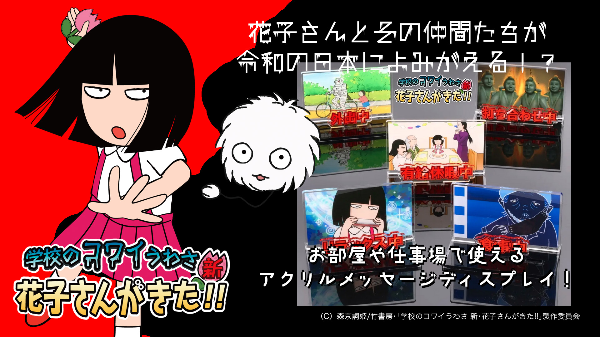 | シリーズ「学校のコワイうわさ 花子さんがきた!!」が30周年を迎えました。おめでとうございます。 当初は人気を考えて、その次が継続を考え、そして、いかにして愛されるかを考えてきました。作品を送ることが形ではなく、「花子さんがきた」と一緒に生活している方の「花子さん」とは、なにかをここ最近テーマにしております。作り手としては、新作というキーワードは頭を浮かべますが、30年前のあの暑い日の夏休みに、テレビを見ていたみんなは、お母さんやお父さんになって、今はならんで配信動画を見ていることでしょう。 花子さんの声を担当している《まゆたん》も、オイラ《イマイヨーイチ》も、30年間みなさんと過ごしていること誇りです。これからあなたの《花子さん》を大切に守っていきます。感謝ありがとうございます。 |